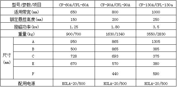 概述: CF、CFL系列悬挂式电磁除铁器,采用全封闭的多工作磁极磁路结构,一直以操作方便,性能稳定可靠、价格合理,维修率低,深得用户的信赖,全封闭的多工作磁极磁路结构,是恶劣工作环境中除铁的常用设备。该系列产品由于采用计算机辅助设计优化改进了产品结构,其技术参数达到了国外同类产品的先进水平。 技术参数: